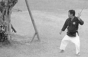 Maître Kenyu CHINEN est spécialiste de cette technique, très spectaculaire et ô combien dangereuse. Le lien permet en outre une saisie du manche très solide. (Ci-dessus: Maître Kenyu CHINEN exécutant le kata Shimotsuki kama).