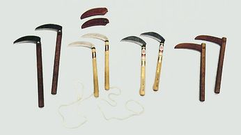 Instrument agricole, le Kama est la faucille des paysans. Cet outil est utilisé tel quel, sans modification. Le manche en bois a une longueur de 30 cm environ. La lame, en acier, est légèrement courbe et perpendiculaire au manche. Le Kama est utilisé par paire. Les techniques consistent à bloquer puis piquer, transpercer ou couper. Son maniement est si dangereux qu'il n'est étudié qu'à partir du 3ème Dan. Son apprentissage peut commencer avec des Kama tout en bois, mais le risque est paradoxalement son absence de risque et, de ce fait, on oublie trop facilement que l'erreur ne serait pas permise avec une arme réelle ; dans ce dernier cas une touche même légère peut être lourde de conséquence. Il est conseillé, une fois les mouvements de chaque technique assimilés, de passer le plus tôt possible aux armes réelles ; quitte à mettre, au début, des protections de lame. Avec cette arme il faut s'habituer très tôt à ne jamais relâcher son attention. Aussi il est fortement recommandé de ne pas faire de longs entraînements avec cette arme lorsque l'on manie de véritables Kama. C'est la huitième arme dans la progression du Kobudo traditionnel d'Okinawa. Elle peut être considérée comme la plus dangereuse.