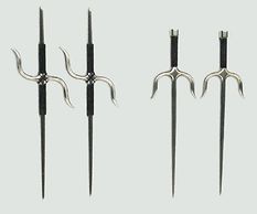 La garde, de forme très particulière, est destinée, tout en protégeant la main, à dévier ou bloquer une attaque de sabre ou de Bô ; elle permettait même de casser les lames de sabre des samouraïs. Ses extrémités pointues permettaient de contre-attaquer en frappant avec un mouvement de poignet.